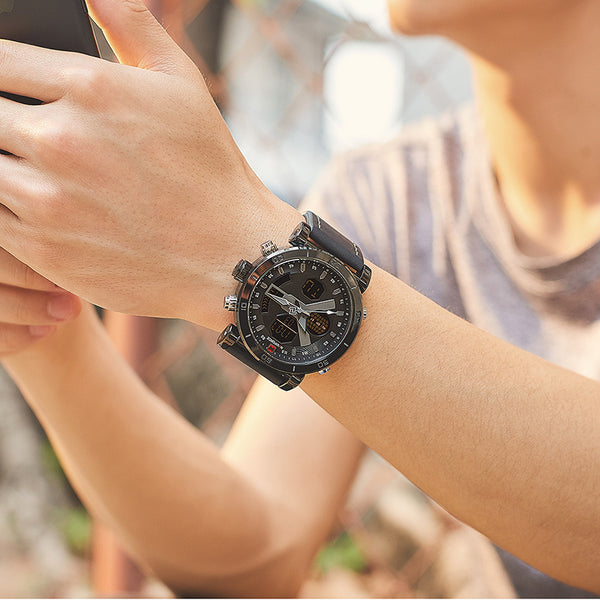 Item Type: Quartz Wristwatches Boxes & Cases Material: No package Feature: Water Resistant,LED display,Multiple Time Zone,Stop Watch,Auto Date,Complete Calendar,Back Light,Week Display,Shock Resistant,Alarm,Chronograph Style: Sport Case Material: Stainless Steel Clasp Type: Buckle Band Length: 25cm Band Material Type: Leather Movement: Quartz Dial Window Material Type: Glass Case Thickness: 16mm Brand Name: NAVIFORCE Dial Diameter: 44mm Model Number: NF9134-BG Band Width: 24mm Water Resistance Depth: 3Bar Case Shape: Round
