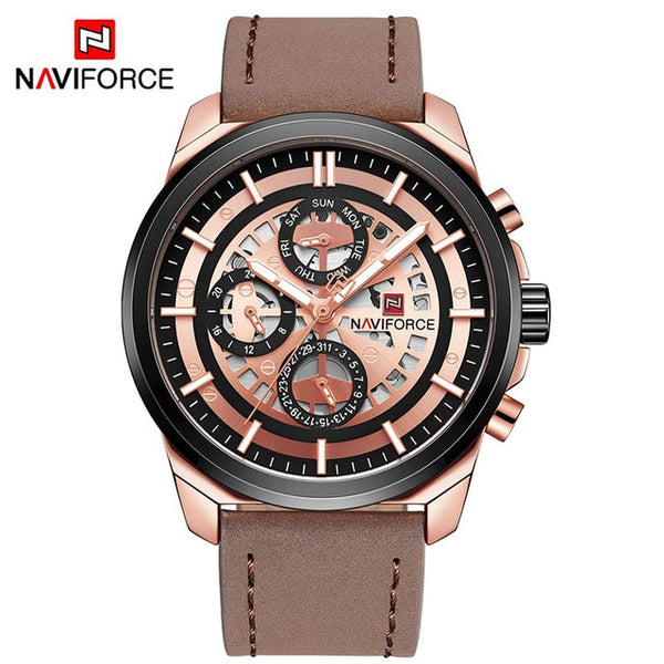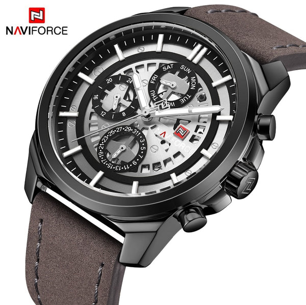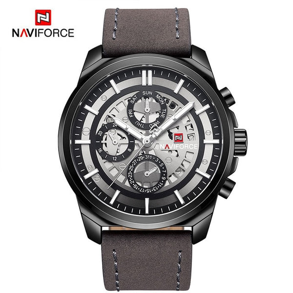 Item Type: Quartz Wristwatches Case Thickness: 13mm Style: Sport Brand Name: NAVIFORCE Feature: Auto Date,Complete Calendar,Week Display,Water Resistant Movement: Quartz Case Material: Alloy Case Shape: Round Band Material Type: Leather Water Resistance Depth: 3Bar Boxes & Cases Material: Paper Dial Window Material Type: Hardlex Model Number: NF9129-BW Band Length: 24.5cm Clasp Type: Buckle Band Width: 23mm Dial Diameter: 44mm Item Type: Quartz Wristwatches Gender: Men Unit Type: piece Package Weight: 0.12kg (0.26lb.) Package Size: 16cm x 10cm x 3cm (6.30in x 3.94in x 1.18in)